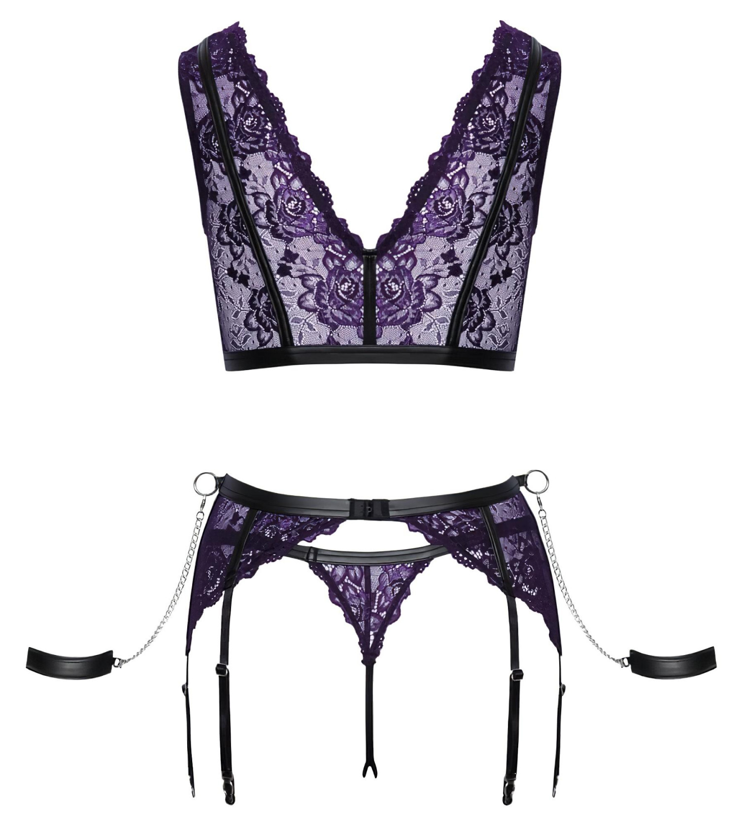 Cottelli Bondage - Lingerie Set with Handcuffs (Black-Purple) - M