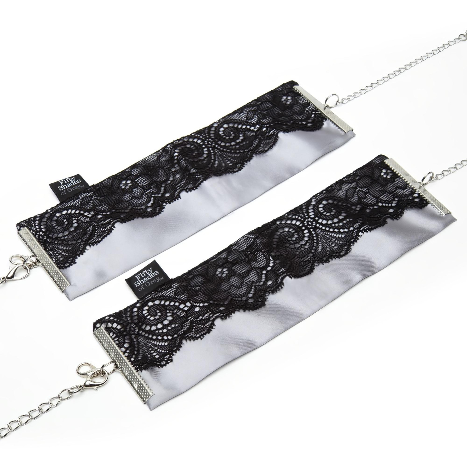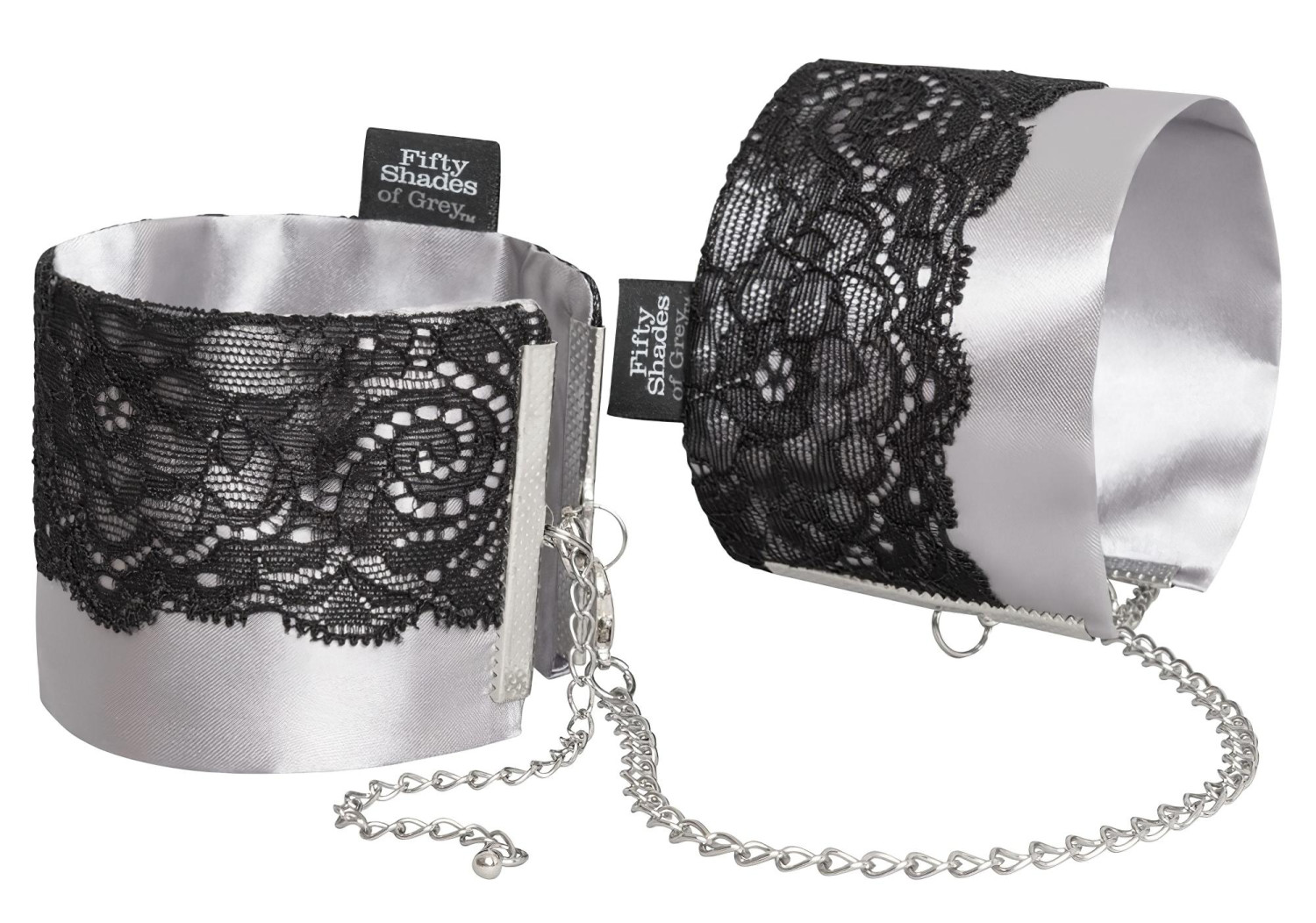 Sensual, silver satin handcuffs with fine black lace decorations.